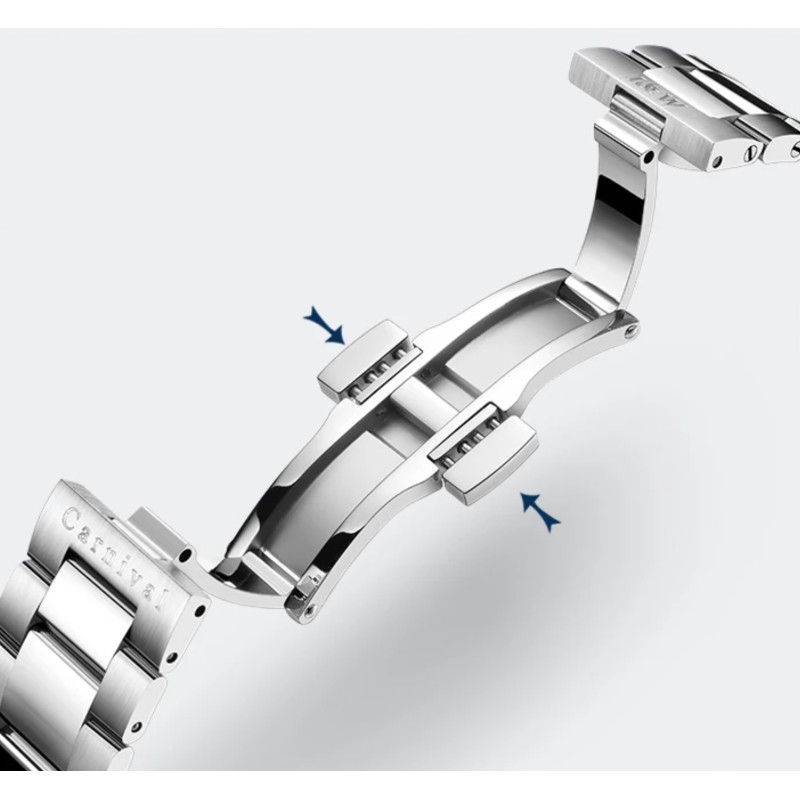 Чоловічі механічні годинники Carnival – це втілення престижу та надійності у кожній деталі. Оснащені високоточним японським механізмом із 24 каменями, вони забезпечують стабільну та довговічну роботу. Завдяки сапфіровому склу годинник стійкий до подряпин і зберігає бездоганний вигляд протягом багатьох років.