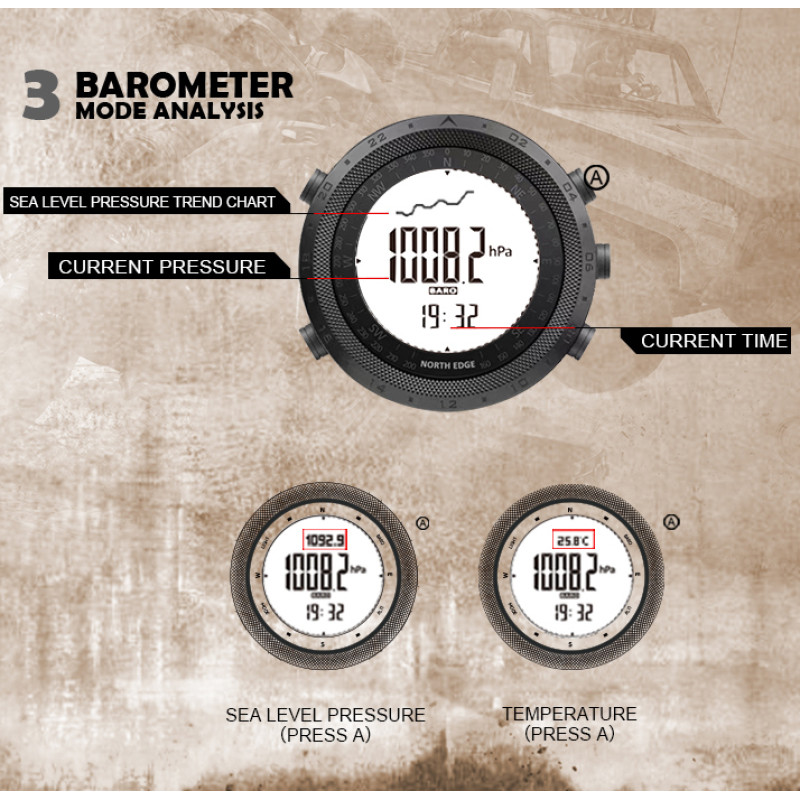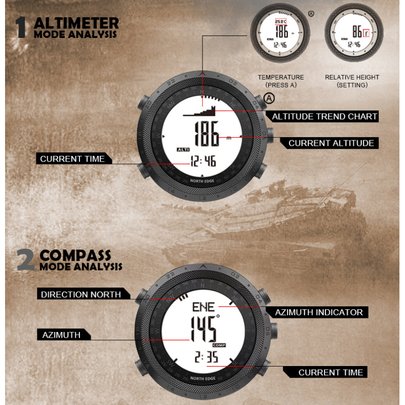 Годинники від бренду North Edge можуть витримувати ультрахолодні температури, а також мають в собі важливі функції, такі як компас, барометр, альтиметр, термометр, крокомір, секундомір, будильник, таймер, підсвічування та інші. Бренд North Edge має репутацію надійних і якісних годинників.