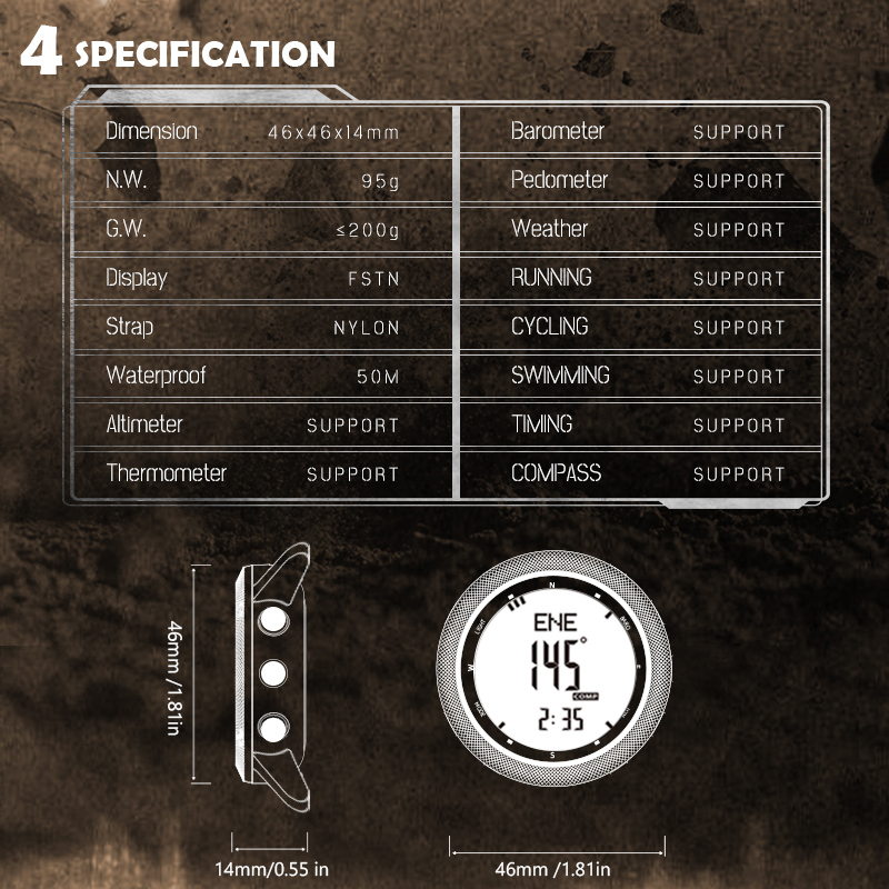 | Функції | Водостійкість 50 метрів, компас, барометр, альтиметр, термометр, крокомір, секундомір, будильник, таймер, підсвічування, пейсер, нагадування про низький заряд. |