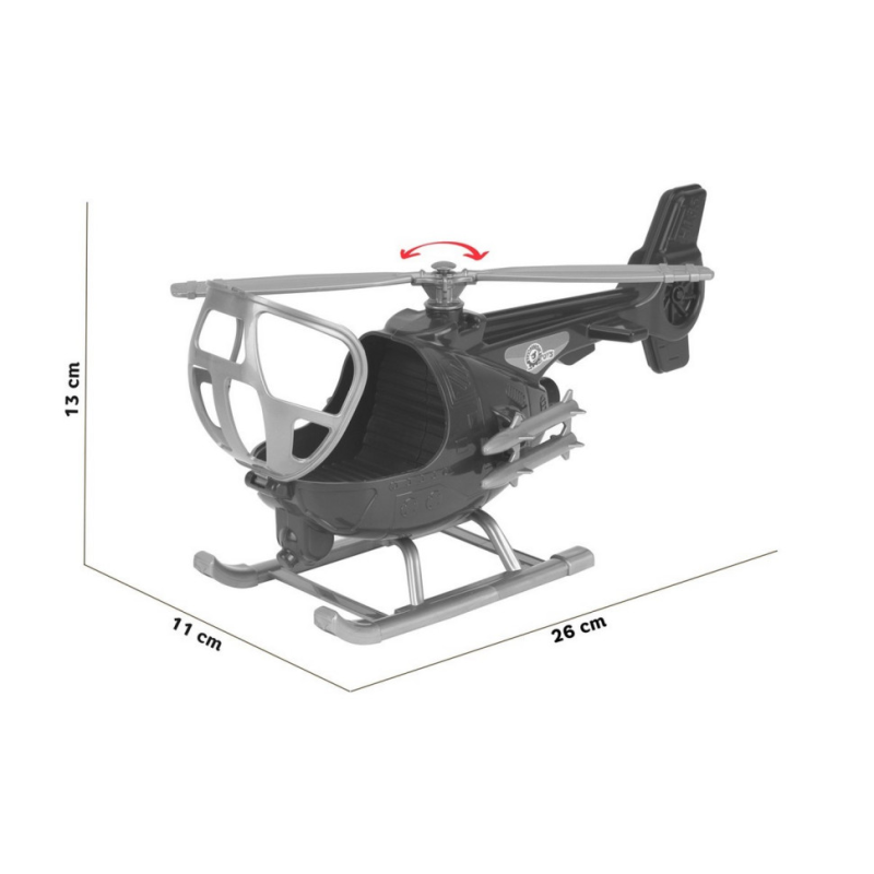 Швидкий та маневровий гелікоптер входять до складу військово-повітряних сил. Потужний гвинт та великі шасі надають іграшці стійкості. До фюзеляжу рятувального вертольота прикріплено баки або контейнери з корисним вантажем. Кабіна відкривається, в ній зручно розмістити фігурку пілота чи улюблену іграшку. Вертоліт прикрашений яскравою патріотичною наклейкою.