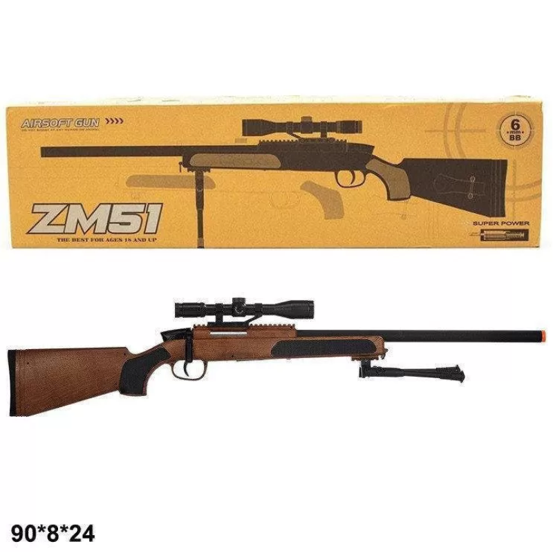 Снайперська гвинтівка CYMA ZM51W зі швидкістю вильоту кулі 80 м / с, місткістю магазина на 20 штук кульок, максимальною дальністю стрільби 50 м і прицільна дальність 7-15 м. Функціональна модель, що володіє всім необхідним набором функціональних характеристик, підкорить серце кожного любителя захоплюючих «войнушек». Щоб поліпшити навички стрільби і прицілювання, при необхідності можна змінювати режими на свій розсуд, регулювати швидкість стрільби. Іграшка рекомендована для розвитку окоміру, уважності, координації рухів, підійде для користувачів старше 18-ти років. Легка, зручна у використанні і компактна гвинтівка стане справжньою знахідкою не тільки для ігор вдома або на дачі, але і сподобається шанувальникам активного відпочинку біля водойми за межами міста. Любителі гри в страйкбол або пейнтбол також по достоїнству оцінять всі переваги цієї вдосконаленої версії з прицілом.