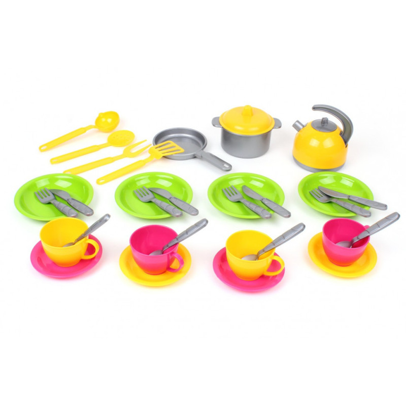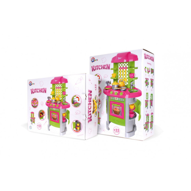 У бічних стінках - дві шафки з поличками для зберігання посуду. Виконаний іграшковий набір в яскравих кольорах.