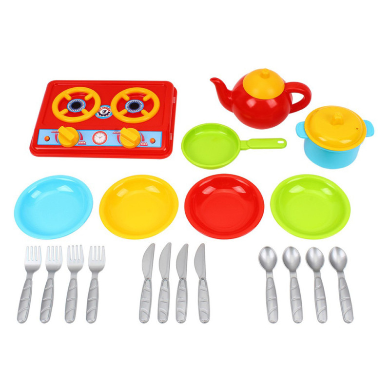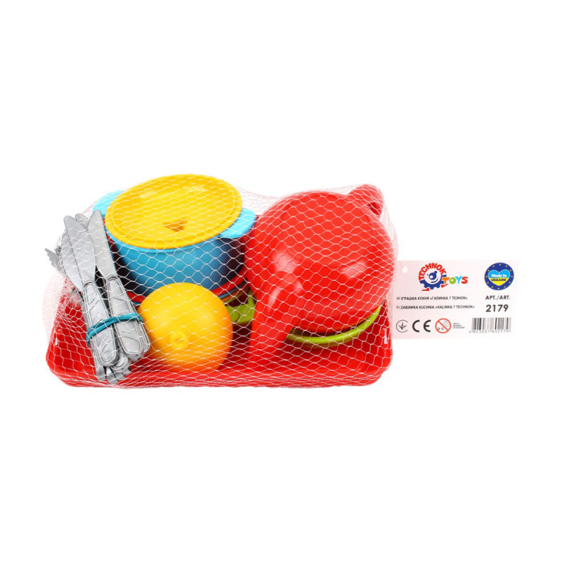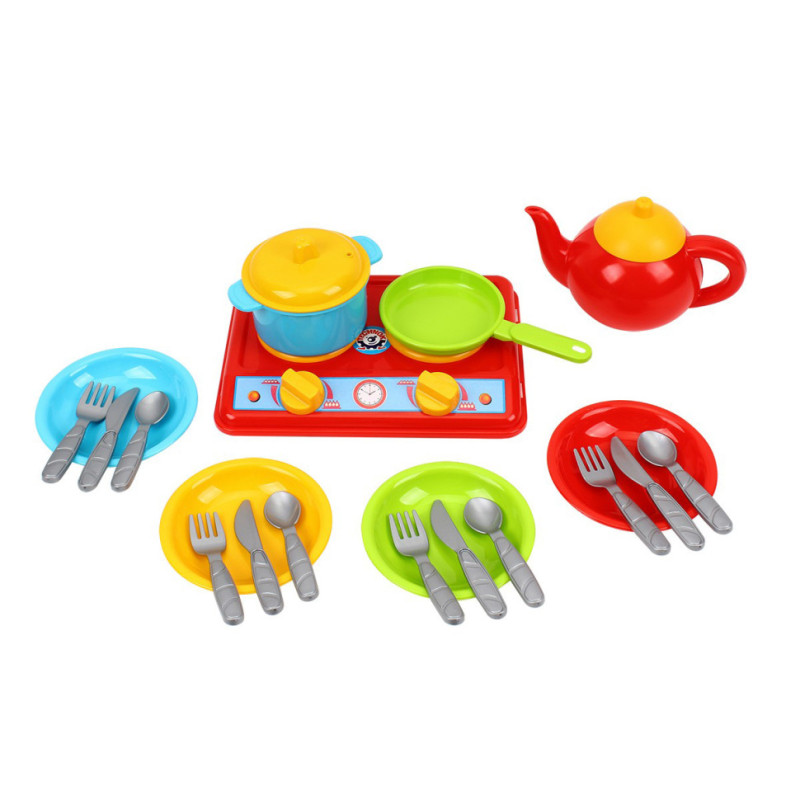 У комплект входить також 4 тарілки, сковорідка, каструля, чайник та столові прибори. Усе кухонне приладдя виготовлене в яскравих, насичених кольорах.