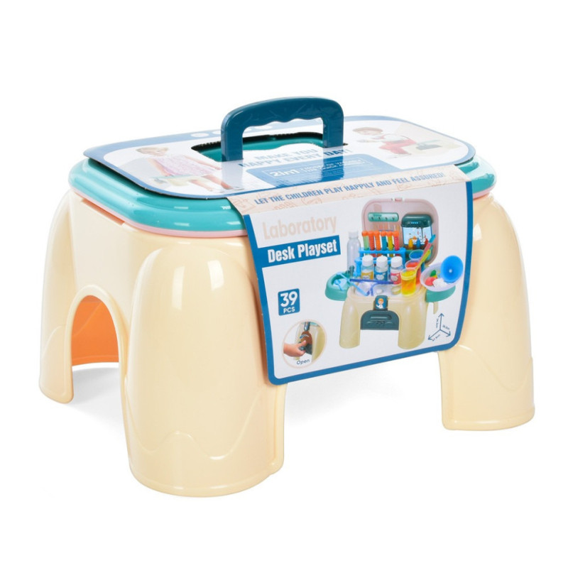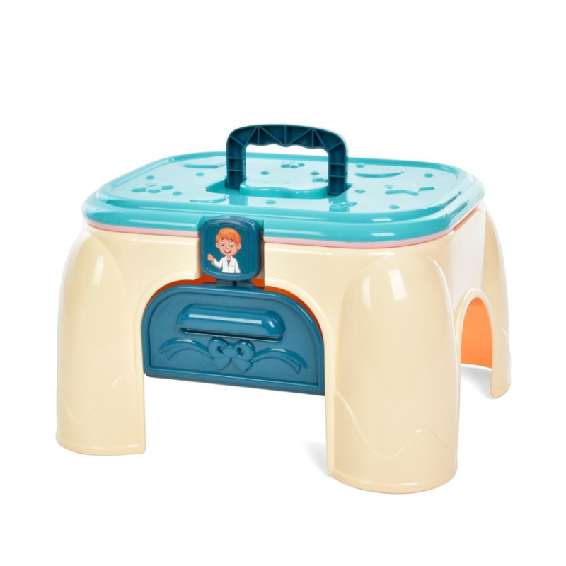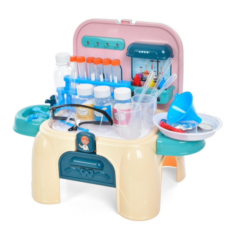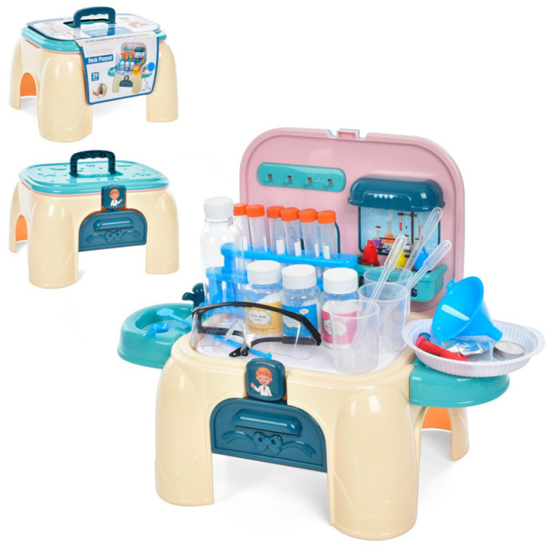 Він містить такі важливі медичні іграшкові інструменти, як: склянки, баночки, пробірки, стілець і безліч інших лікарських аксесуарів.