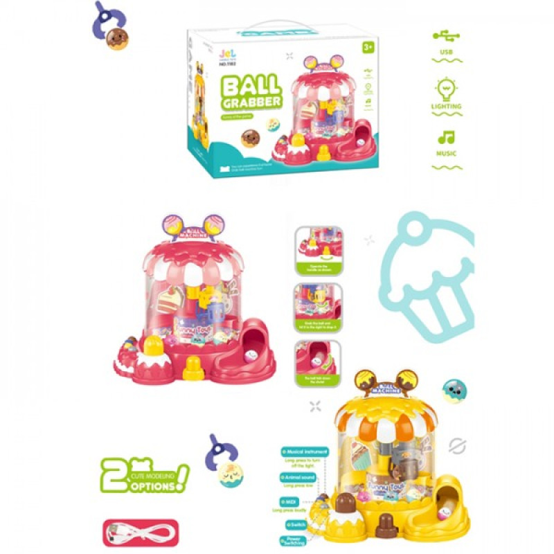 Дитячий ігровий автомат B-1182. Смикнувши за ручку, можна спостерігати які картинки випадають при обертанні барабанів, а при збігу виграшної комбінації з отвору посипляться "гроші".