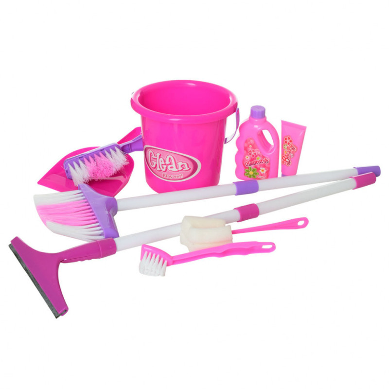 В даному наборі є все, що потрібно для захоплюючого прибирання: відро, щітка для миття вікон, віник, совок, губка, щітки, пляшечки. Дитина, звикнувши граючи робити прибирання, підростаючи буде з легкістю і з задоволенням підтримувати порядок в повсякденному житті.