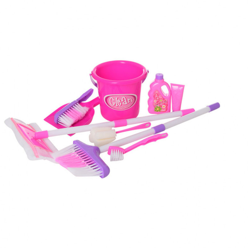 В даному наборі є все, що потрібно для захоплюючого прибирання: відро, щітка для миття вікон, віник, совок, губка, щітки, пляшечки. Дитина, звикнувши граючи робити прибирання, підростаючи буде з легкістю і з задоволенням підтримувати порядок в повсякденному житті.