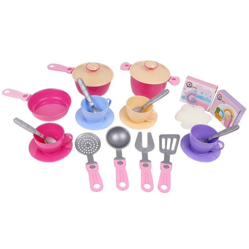 У наборі є все, щоб маленька господиня реалізувала свої кулінарні задуми. Каструлька і сотейник для смачних борщів і корисних овочів, сковорідка для смаження. Шумівка, черпак і лопатка зроблять процес приготування максимально реалістичним. Також малюки зможуть запросити друзів на чаювання з різнокольоровими чашками на блюдечках.