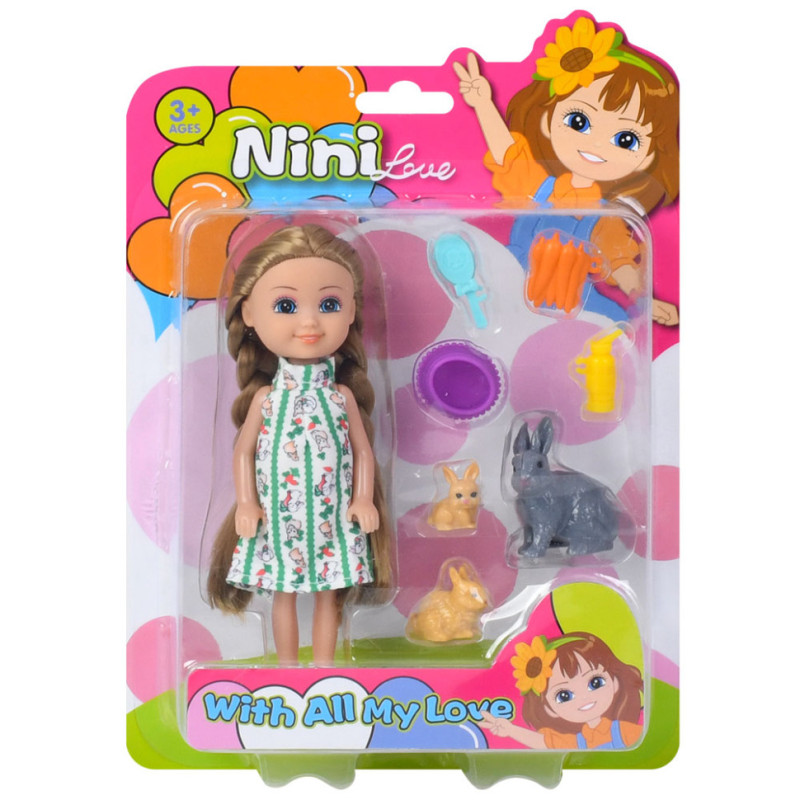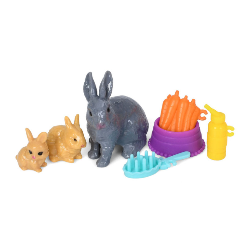 У наборі лялька розміром 14 см, 3 кролика, морква та аксесуари, що дозволяє дитині вигадувати різноманітні історії та доглядати за улюбленцями.