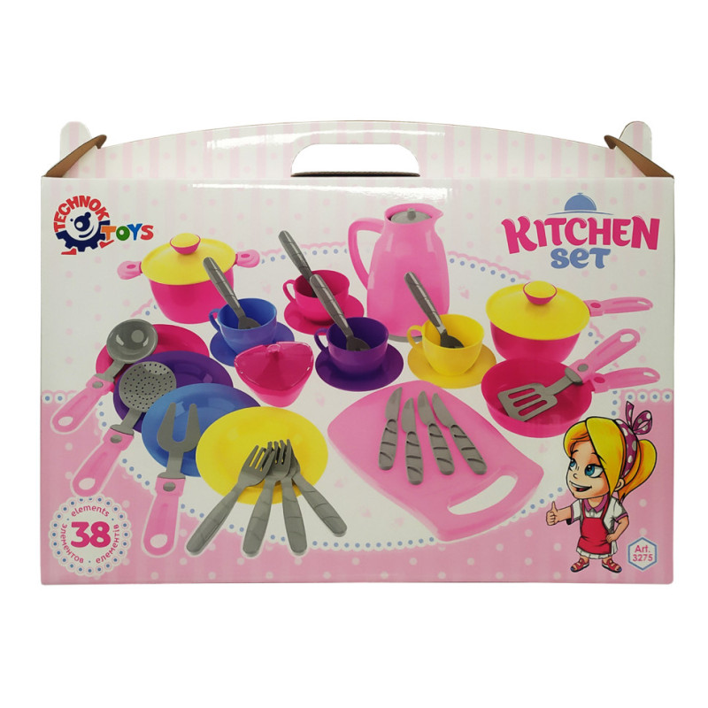 Іграшка "Кухонний набір 4". У наборі 38 елементів (у т. ч. кавник і дощечка для нарізки) виконаних в оригінальній кольоровій гаммі модельної лінійки Кухонних наборів ТехноК. Комплектація: сковорода, каструля, сотейник, цукорниця з кришкою, кавник з кришкою, дощечка для нарізки, черпак, шумівка, вилка велика, лопатка, кришка - 2 шт, тарілка - 4 шт, блюдце - 4 шт., чашка - 4 шт., ложечка - 4 шт ., виделка - 4 шт., ніж - 4 шт.
