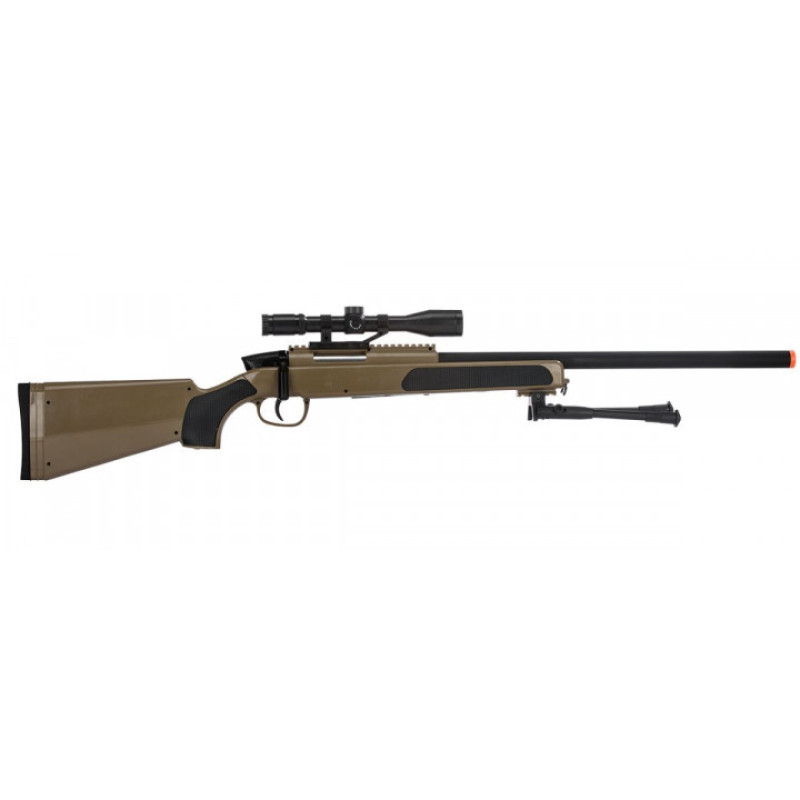 Іграшкова гвинтівка, схожа на справжню. Виготовлена з міцного полімерного матеріалу, з металевими елементами. З кульками (6 мм), підставкою, лазерним прицілом на сошках. Швидкість кулі - до 90 м /c. Дальність польоту кулі - до 50 метрів. У магазині - 25 куль.