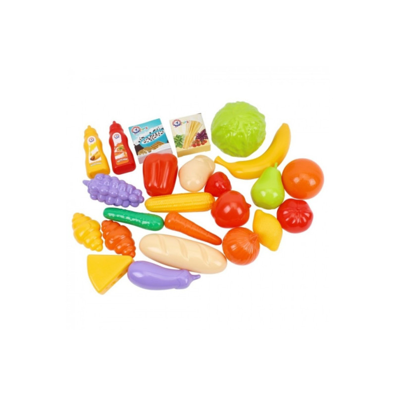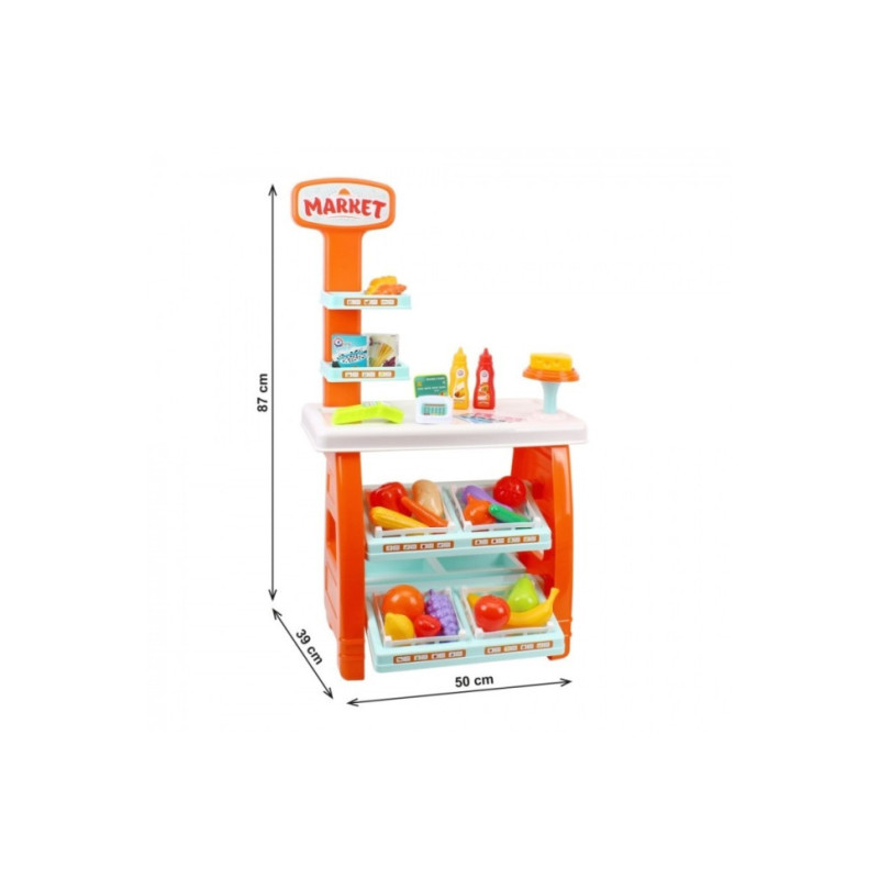 У наборі є прилавок з полицями для ящичків з різноманітними корисними та апетитними іграшковими продуктами: від соковитої полуниці та стиглих бананів до ароматного батона й сиру. У крамниці чималий асортимент: круасани, батон, сир, капуста, картопля, кукурудза, огірок, помідор, морква, перець, баклажан, цибуля, груша, яблуко, банан, виноград, лимон, апельсин, полуниця. На прилавку є тортівниця для презентації найсмачніших продуктів і додаткові верхні полиці для акційних товарів, дві картонні коробочки із спагеті та пластівцями + 2 пляшечки із кетчупом і гірчицею.