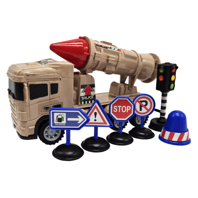 Пластикова військова машинка "Ракетна установка". Довжина машинки - 24 см. Ракета піднімається й опускається, фіксується у двох позиціях. Машинка виконана з якісного пластику, міцна та ударостійка. Прикрашена наклейками, є дорожні знаки.