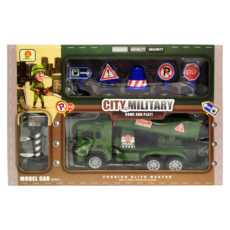 Пластикова військова машинка "Ракетна установка". Довжина машинки - 24 см. Ракета піднімається й опускається, фіксується у двох позиціях. Машинка виконана з якісного пластику, міцна та ударостійка. Прикрашена наклейками, є дорожні знаки.