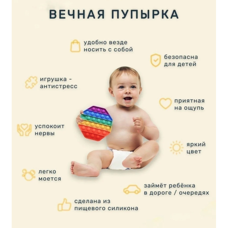 Гра Попит допомагає добре розвивати дрібну моторику у дітей. Поєднує в собі велику кількість ігор: гра на швидкість, хто останній натисне кульку, а також зняти стрес і заспокоїти нерви. Візьміть із собою антистрес Pop It у подорожі, кафе та діти будуть зайняті на довгий час. До того ж іграшка досить легка у догляді, можна мити навіть у посудомийній машині.