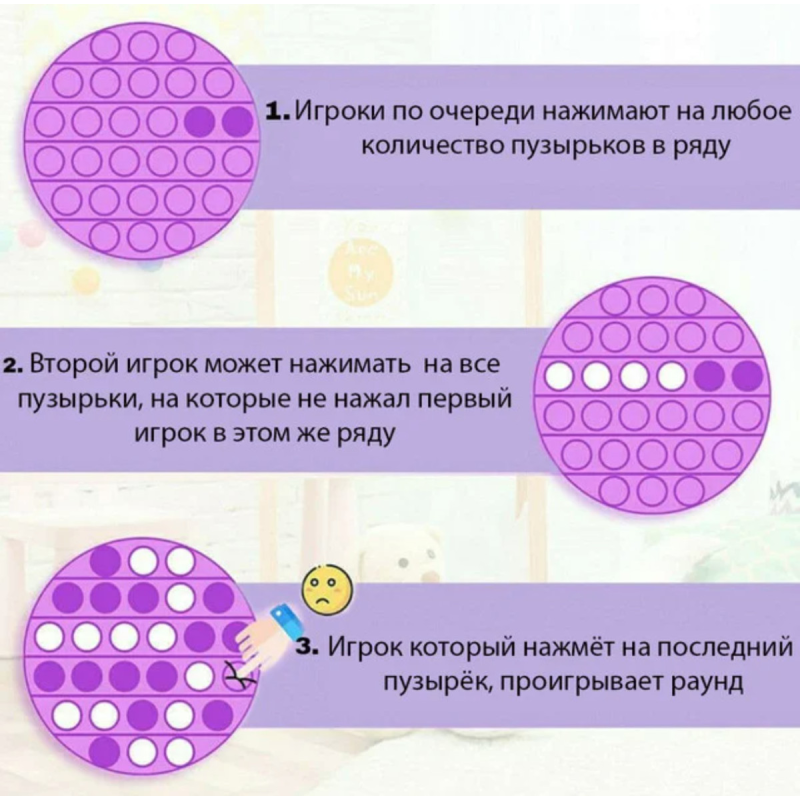Правила: гравці по черзі натискають будь-яку кількість бульбашок в одному ряду; кожен гравець може вдавлювати по одній бульбашці за раз, або кілька, але вони повинні бути поруч; одночасно можна вдавлювати бульбашки тільки з однієї лінії бульбашок; гравець, який втисне на останню бульбашку, програє. Виконано з якісного та безпечного силікону.