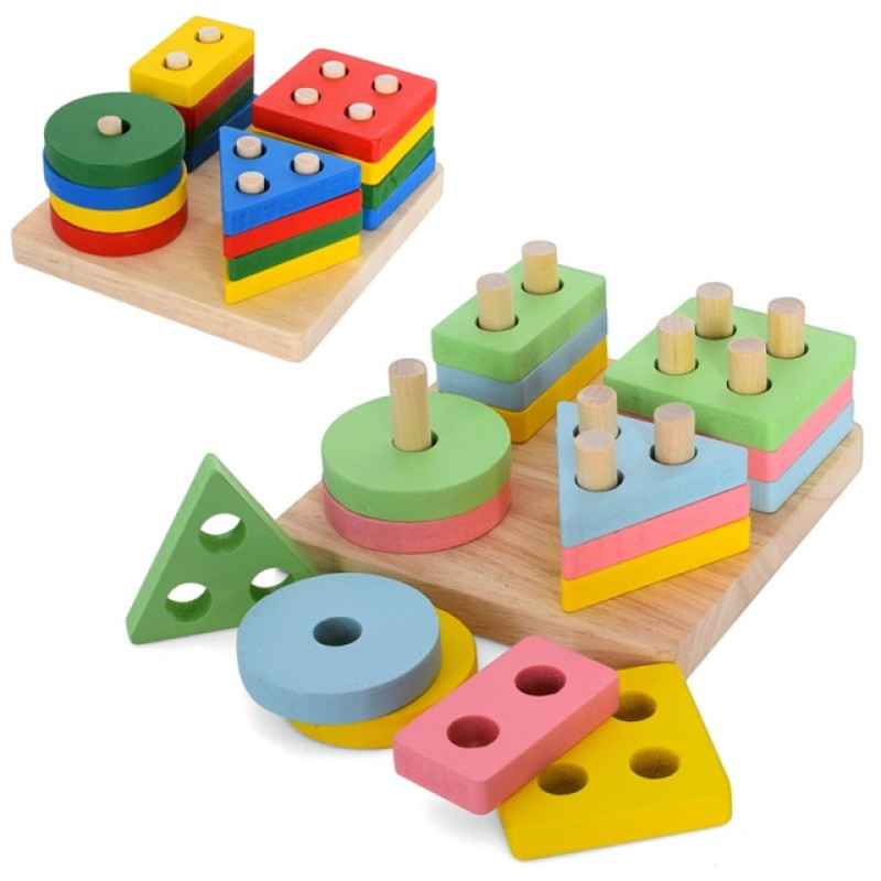 Дерев'яна іграшка Геометрика MD 2907. Ця логічна іграшка познайомить дитину з геометричними фігурами та квітами. Крім того, дитині потрібно буде знайти для кожної фігурки місце на основі виходячи з кількості дірочок у фігурці та стовпчиків у основі.