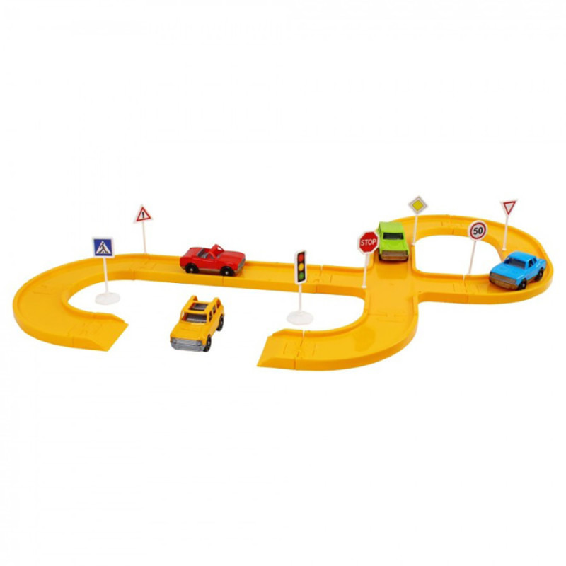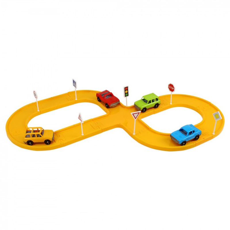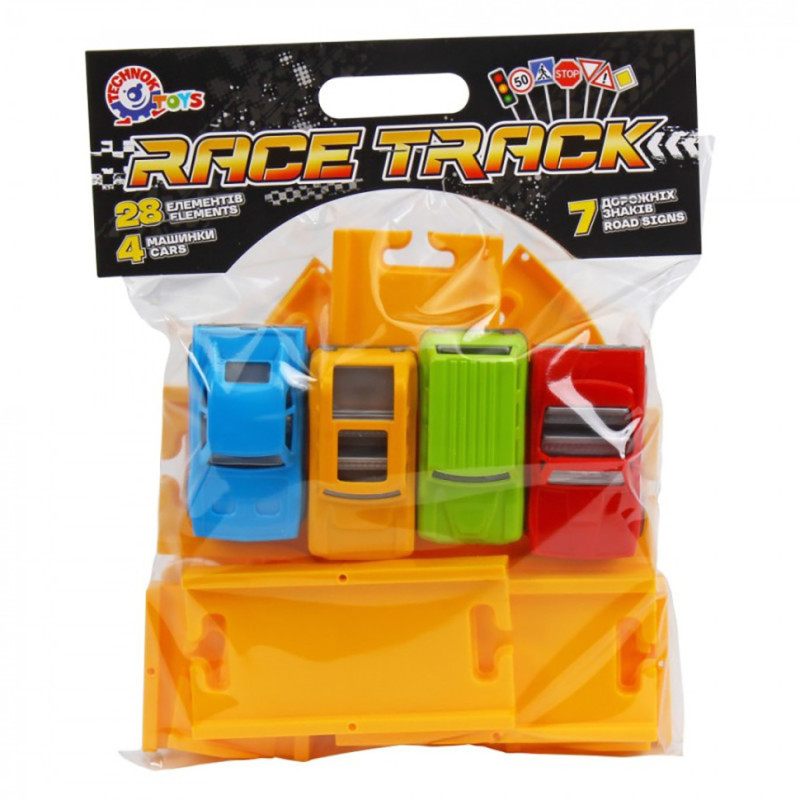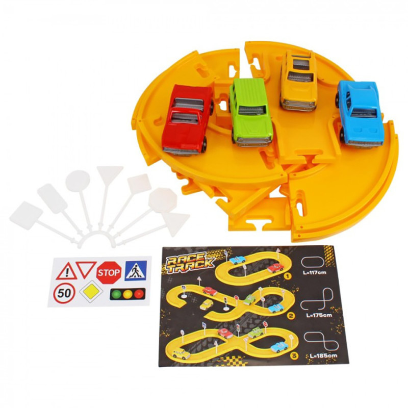 У наборі: дорожні знаки – 7 шт. і основа дорожніх знаків – 2 шт., наліпки на знаки, кольорові автомобілі – 4 шт., елементи треку – 26 шт., та кольорова інструкція.