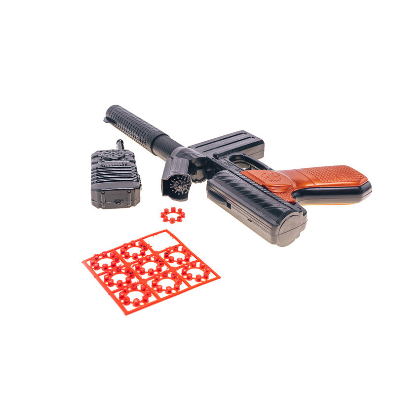 Пістолет працює з пістонами з вісьмома звуковими пострілами, довжина - 34 см, висота - 14,5 см.