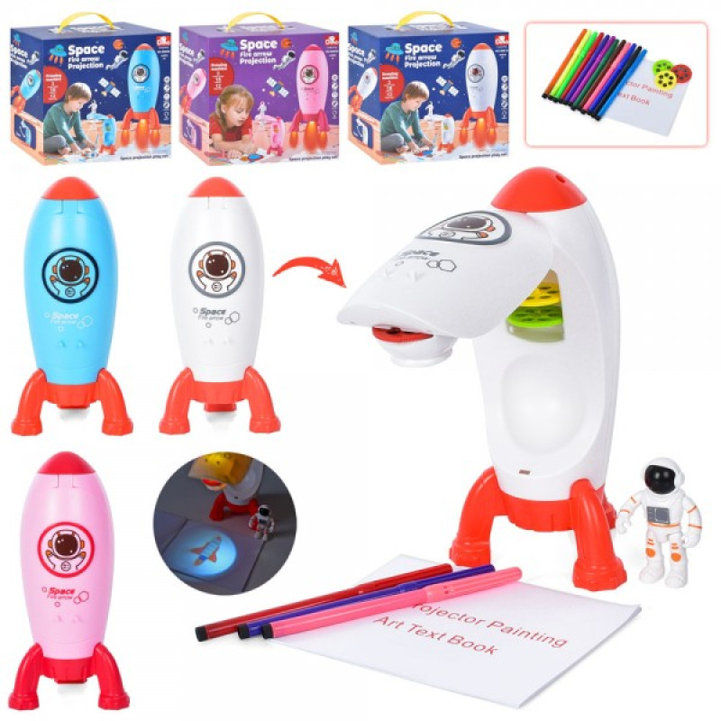 Дитячий проектор Ракета 68818-28-38 22 см для малювання проектує кольорове зображення зі спеціальних насадок на дошку. Завдяки чітким видимим контурам дитина зможе їх обводити та малювати різні малюнки.