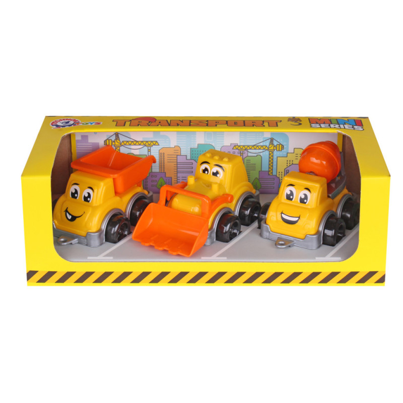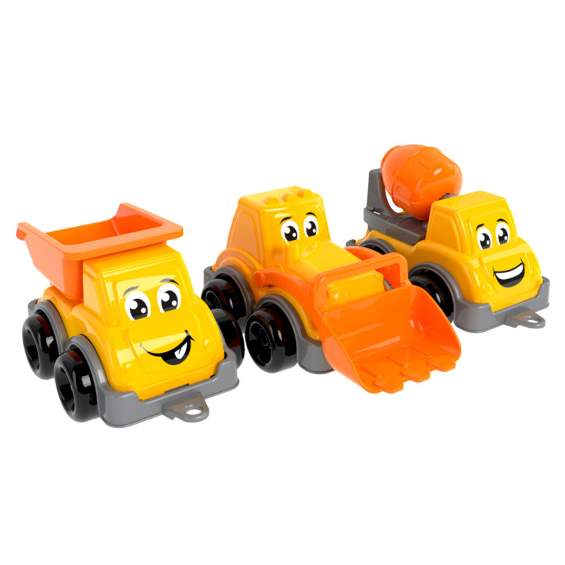 У наборі маленькі самоскид, трактор та автоміксер. З іграшками цікаво грати у пісочниці та вдома. Можна будувати дороги, мости та будинки, перевозити вантажі, змішувати бетон чи копати траншеї.
